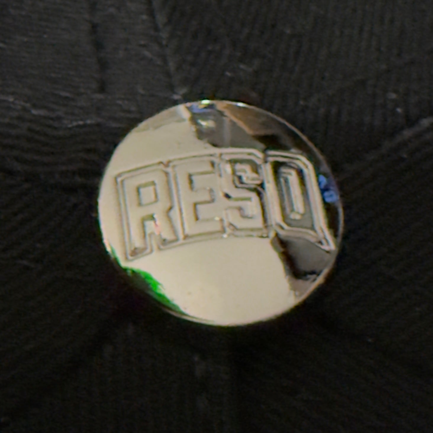Gorra Negra con la R en Diamantes Verdes y Botón y tag en Metal.